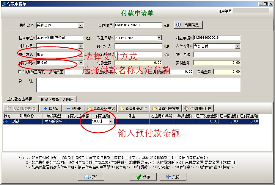 注:因?yàn)闆]有到貨驗(yàn)收入庫,所有付款名稱要為:“定貨款”、“訂貨款”、“預(yù)支款”、“預(yù)付款”,并且要對(duì)應(yīng)好合同編號(hào)(系統(tǒng)規(guī)定必須有合同才能做預(yù)付款或定金等付款)。