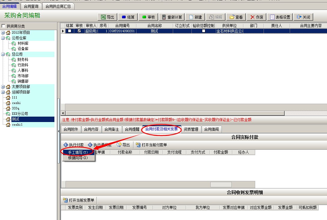 合同內(nèi)容錄入完畢,審核采購合同,在沒有執(zhí)行到貨驗(yàn)收的情況下,點(diǎn)擊合同付款及相關(guān)發(fā)票,執(zhí)行付款,選擇手工填寫,彈出付款申請(qǐng)單,選擇付款方式,付款明細(xì)中輸入付款金額,然后保存 。