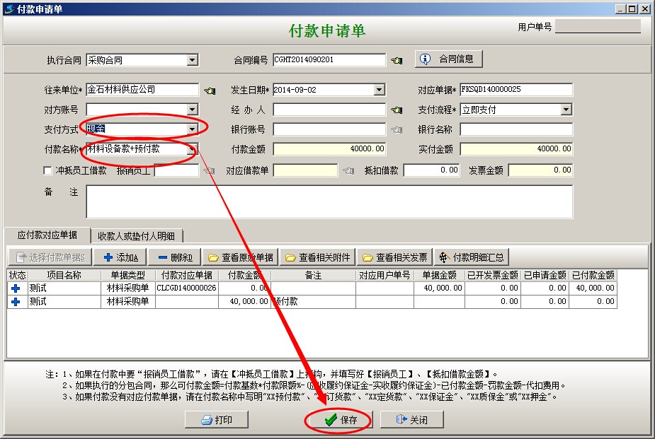 注:上圖所示;付款申請(qǐng)單的兩行明細(xì)為兩個(gè)材料采購單,第一行的[付款對(duì)應(yīng)單據(jù)]為CLCGD140000026已付款金額40000已經(jīng)等于單據(jù)金額(表示該采購單已經(jīng)付完,是通過上一個(gè)付款單自動(dòng)對(duì)應(yīng)上的付款數(shù)),所以付款金額為0,第二行的[付款對(duì)應(yīng)單據(jù)]為空,表示本項(xiàng)支付的款項(xiàng)為預(yù)付款),上面的付款名稱為材料設(shè)備款+預(yù)付款;