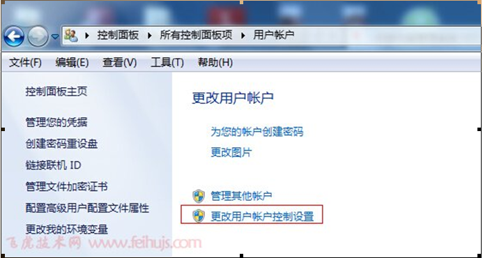 在彈出用戶賬戶界面,選擇更改用戶賬戶控制設置,如下圖: