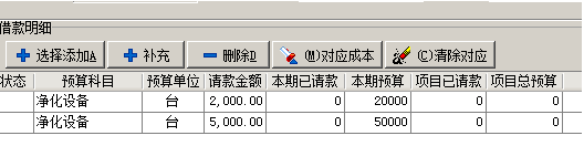 我們選擇其中兩項,高效過濾器和移動式消毒車,其中高效過濾器預算金額為20000元、移動式消毒車預算費用為50000元,當我們的請款金額小于預算金額時候,顯示為正常的白色。