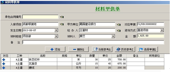 1. 【材料甲供單】這張單據,是在甲供材料入場時填寫的業務單據,填寫單據時,進場方式選擇直進項目,則該批材料會直接進入項目甲供成本。