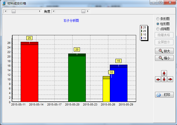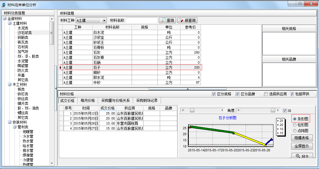 工程項目管理系統中【材料成交價格分析圖】是用來查詢原材料成交價格的分析圖表,界面如下: