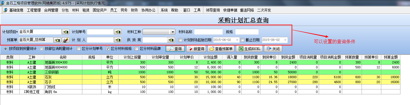 工程項目管理系統中【采購計劃執行匯總】 可以設置多重條件來匯總所有的【采購計劃單】的執行情況,如下圖:
