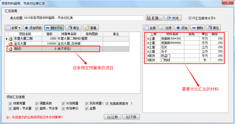 1、窗口左邊的表格為企業現有的項目信息,右邊的表格為材料維護中的材料信息。