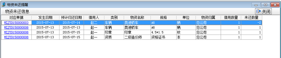 在填寫物資借用單時,填寫好預(yù)計歸還日期,當?shù)筋A(yù)計歸還日期時,會自動提醒物資未還信息。如下圖:
