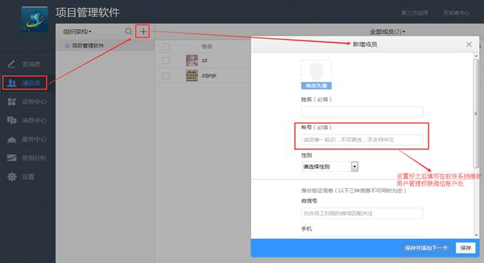 ⑵ 在微信企業號界面通訊錄模塊添加成員。如下圖: