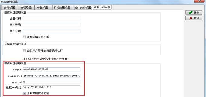 4. 獲取corpid, corpsecret和agentid好后登陸超級用戶在【系統維護】-【系統全局設置】-【企業認證設置】填寫微信認證信息。(此處需要開發商授權)