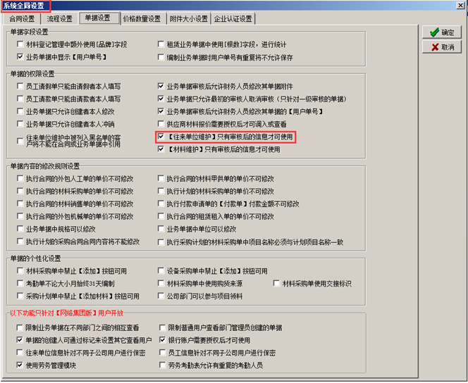 在金石工程管理軟件中可對添加的“往來單位信息”進行審核(此功能為可選功能),使用“材料審核”的功能前,需在“系統維護”-“系統全局設置”-“單據設置”中將此功能開關打開。如圖: