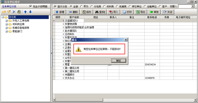 如果工程項目管理軟件中的“往來單位”信息已經通過審核,則不可進行分類的變更,系統會給出對應的提示。如圖: