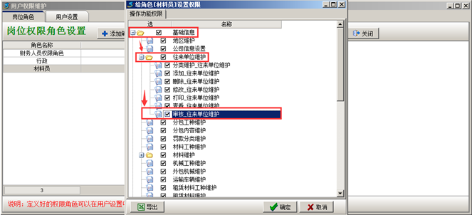 在“系統維護”-“用戶管理權限設置”給具有“往來單位”審核權限的用戶分配權限,如圖: