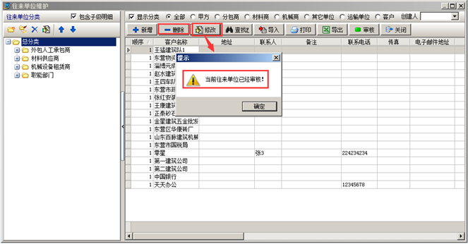 工程項目管理軟件中審核過的“往來單位”信息不允許進行“刪除”或“修改”的操作,“刪除”或“修改”時系統會給出對應的提示,如圖: