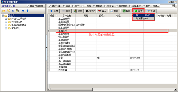 有審核權限的用戶要及時對新增加到工程項目管理軟件中的“往來單位”要經過進行審核,審核通過之后往來單位信息可在系統單據中使用。如果“往來單位”信息未經過審核或者審核未通過,“往來單位”信息在工程項目管理軟件業務單據中不可用。