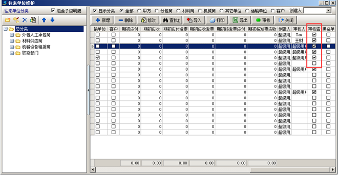 具有“審核_往來單位維護”權限的人進行審核,選中對應的“往來單位”并點擊審核的按鈕,審核通過(點擊“取消審核”可取消審核),審核通過的“往來單位信息”,系統會在對應的復選框中打鉤,如圖: