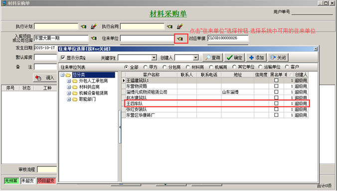 工程項目管理軟件中審核通過的“往來單位”信息可在系統業務單據中可顯示并使用,審核未通過的“往來單位”在系統業務單據中不可用。如圖: