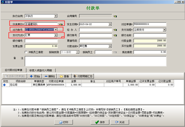可在工程項目管理軟件的往來單位信息中設置多個銀行賬戶,在財務使用付款申請單、付款單、收款單時,可調用賬戶信息,如下圖: