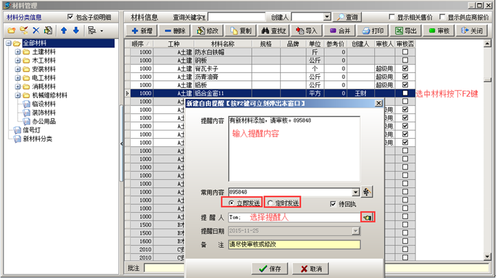 (注:該提醒需要讓做工地上添加新材料的人按F2鍵單獨給維護員發一條信息,也可以開通手機提醒功能來提醒材料維護員)