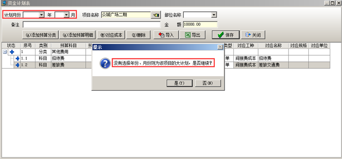 在工程管理軟件的資金計劃單中若選擇計劃月份,則資金計劃表為本項目當月的資金計劃,若不填月份,則資金計劃表默認為本項目的總的預(yù)算,工程管理軟件會給出相應(yīng)的提示。如圖: