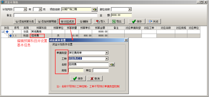 (2)在分類下面添加詳細的“預(yù)算明細”,此時要給預(yù)算明細設(shè)置“對應(yīng)成本”,在“對應(yīng)成本設(shè)置的對話框”設(shè)置資金計劃條件,選擇“單據(jù)類型”、“工種”以及“規(guī)格”,