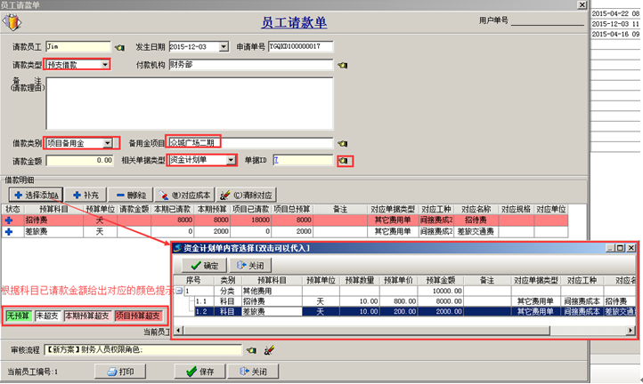 注:預(yù)算明細添加到請款單中,則系統(tǒng)會自動計算當前項目在對應(yīng)預(yù)算科目下的已借款金額,對比資金計劃單中的預(yù)算金額,以不同的顏色提示用戶是否超支(本期預(yù)算超支或項目預(yù)算超支)。如圖: