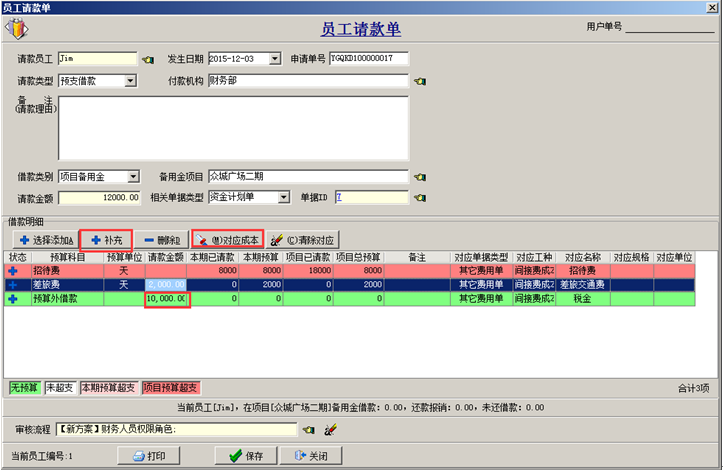 如果需要申請的預(yù)算科目在工程管理軟件的資金計劃單中沒有設(shè)置,可在“員工請款單中”進行補充,點擊“補充”按鈕,對應(yīng)成本并輸入請款金額。在“員工請款單”申請項目備用金時。單據(jù)中補充的無預(yù)算的科目以“預(yù)算外借款”顯示顏色為綠色。如圖: