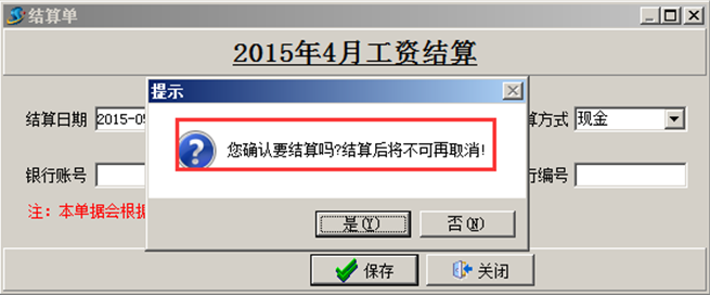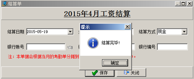 整單結算,則點擊“結算”-“整單結算”,并輸入工資發(fā)放的基本信息,點擊“保存”確認結算。工資發(fā)放單整單結算之后不可再取消。如圖: