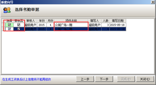在做員工工資表時,選擇生成四月份工資表,并同時選擇“眾城廣場一期”和“眾城廣場二期”的考勤單據(jù)。