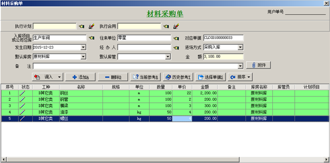 工程管理軟件中采購原材料到庫房做材料采購單,入庫庫房選擇生產(chǎn)車間的庫房。如圖: