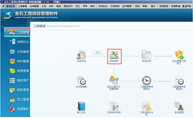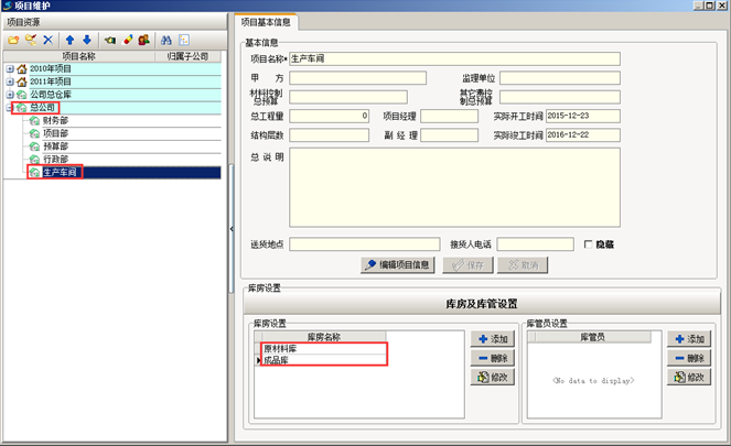 首先在金石工程管理軟件“工程管理”的“項目維護”中,在公司節(jié)點下建立“生產(chǎn)車間”并設立對應庫房,這樣便于對用于生產(chǎn)的原材料或者產(chǎn)品進行管理。如圖: