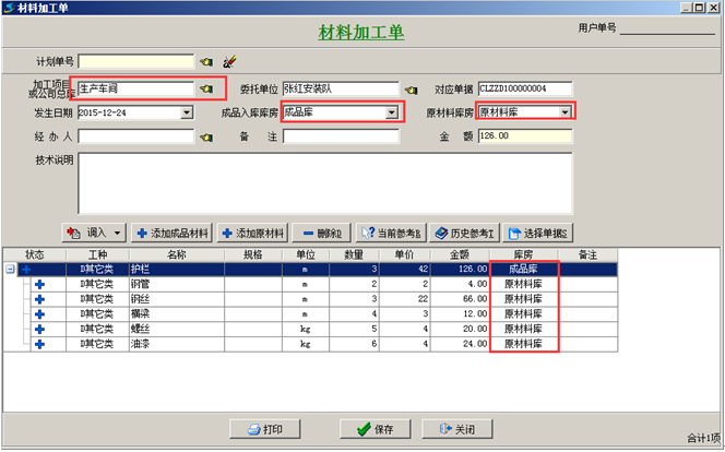 注:(1)在材料加工單的材料列表中對應好各材料所在的庫房。否則系統(tǒng)會默認為默認的“成品入庫庫房”或“原材料庫房”。