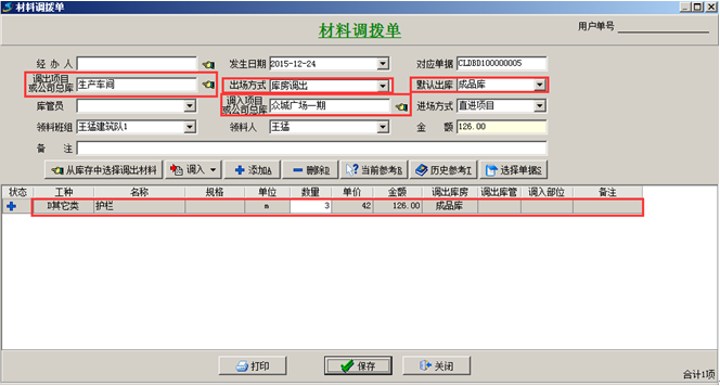 項目上使用產(chǎn)成品時,需要從“生產(chǎn)車間”將產(chǎn)品調(diào)撥到項目上,在工程管理軟件中做“材料調(diào)撥單”,填寫調(diào)撥單時,調(diào)出項目要選擇“生產(chǎn)車間”,出廠方式選擇“庫房調(diào)出”,并選擇對應的庫房,選擇對應的調(diào)入項目以及“領料班組”和“領料人”。如圖: