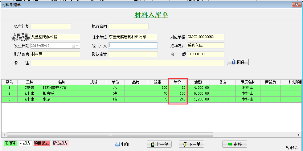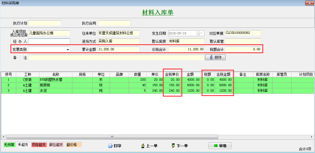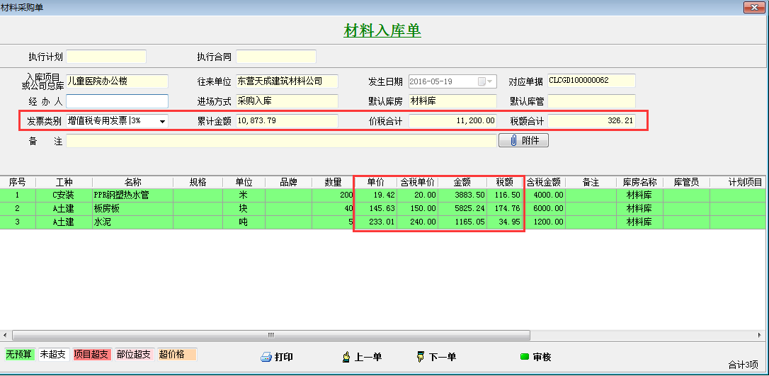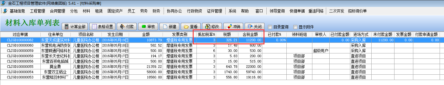 2.營改增.以前版本做的單據如何實現價稅分離調整?我們以材料入庫單(即材料采購單)為例,進行演示: