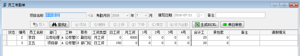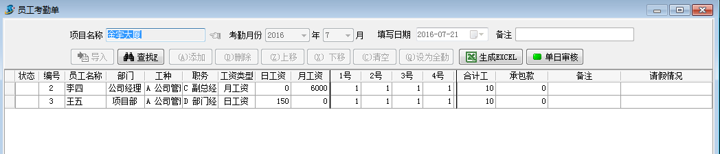 3. 在工程項目管理系統(tǒng)建立員工考勤單。我們以李四和王五在金宇大廈項目分別出勤10天,在中央豪庭項目分別出勤20天為例,建立考勤單為例。如下圖: