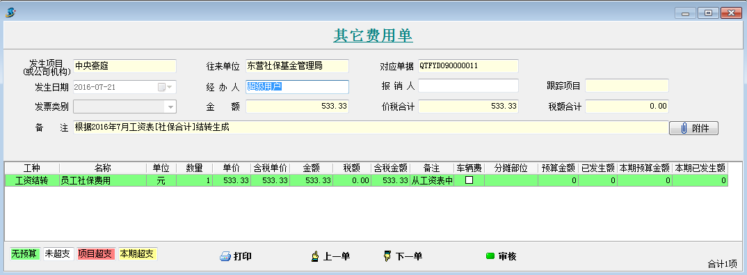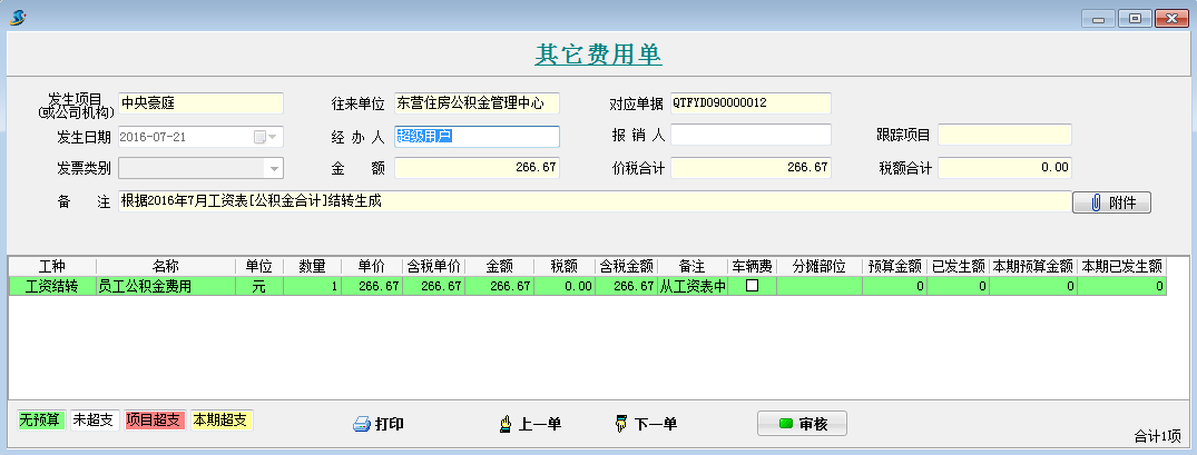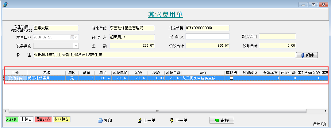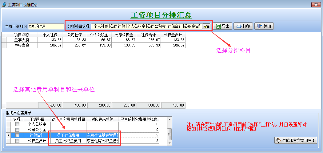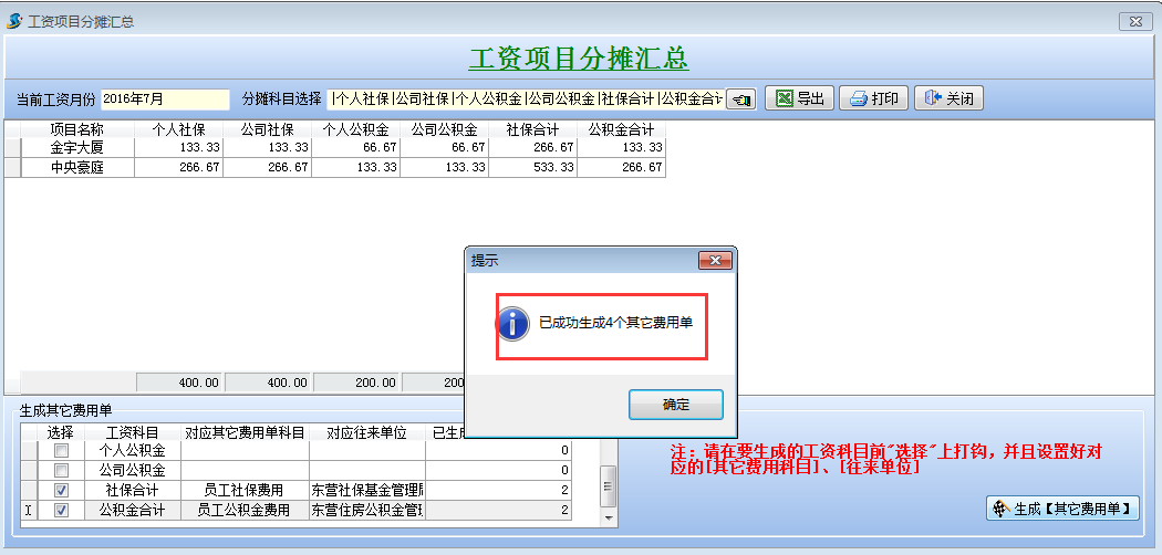 打開待攤費用模塊,選擇好分?jǐn)偪颇浚斜碇芯蜁@示出每個項目分?jǐn)偪蛻舻拿骷?xì)。同時在這個模塊可以直接生成其它費用單,選擇好社保合計和公積金合計的對應(yīng)其它費用單科目和對應(yīng)往來單位,點擊生成工程項目管理系統(tǒng)【其它費用單】,直接可以生成四張其他費用單。