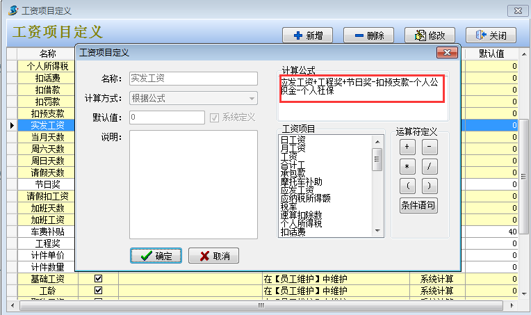 2. 然后在工程項目管理系統(tǒng)【員工管理】-【工資項目定義】設(shè)定好實發(fā)工資的公式和新增社保合計,公積金合計兩個工資科目。其中實發(fā)工資公式中要減去個人社保和個人公積金。如下圖: