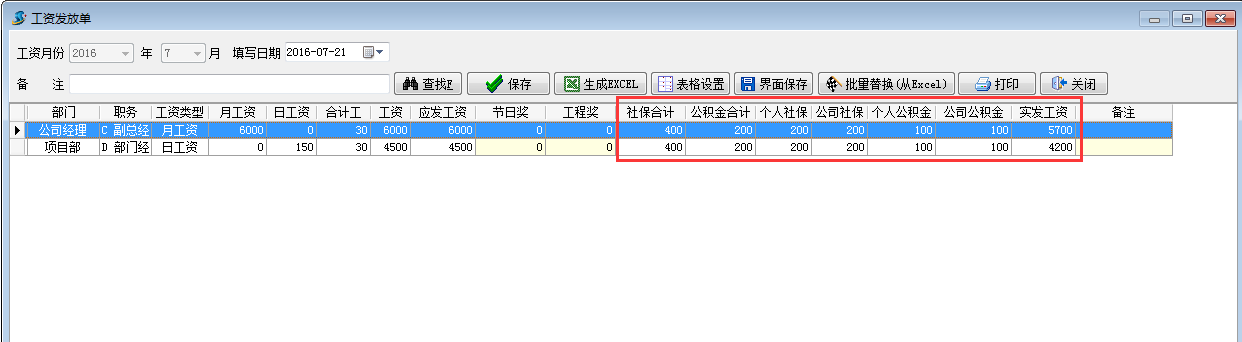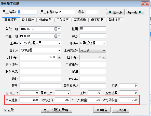 1. 首先在工程項目管理系統(tǒng)員工維護(hù)填寫好個人社保,公司社保,個人公積金,公司公積金相應(yīng)的金額。如下圖: