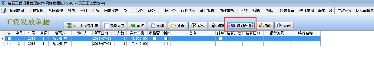 工資表保存后,選擇工程項目管理系統(tǒng)【待攤費用】模塊。如下圖: