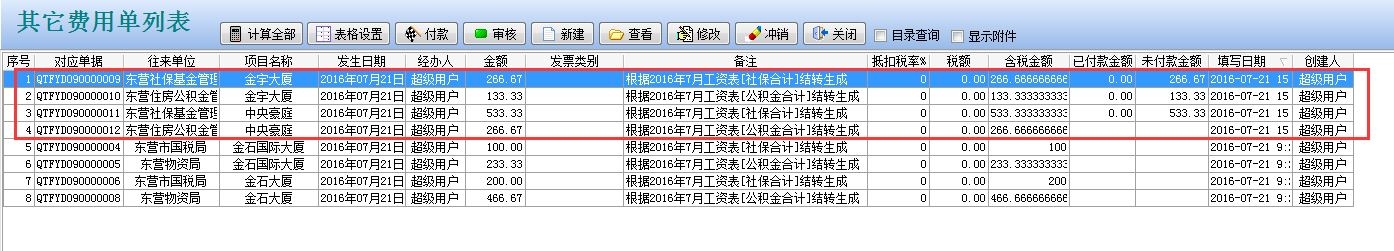 回到【財務(wù)管理】其它費用單列表,就會看到這四張其它費用單。