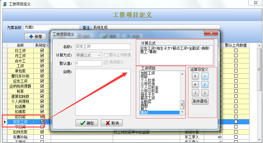 雙擊選擇實發(fā)工資,通過工資項目和運算符定義編輯計算公式(運算字符一定要用鼠標點擊下圖運算符定義選擇,不能用鍵盤直接輸入)