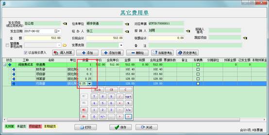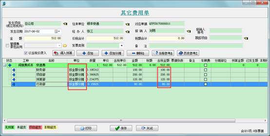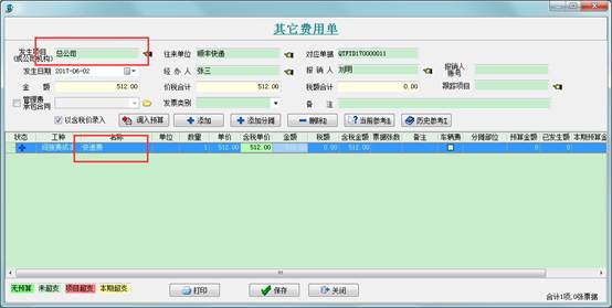 發(fā)生的項目我們選擇總公司,費用名稱為快遞費(可以事先在費用科目維護里設(shè)置好)。