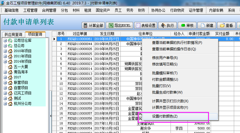 1、升級施工管理軟件最新版后,“財務(wù)管理”→“付款申請單列表”點擊鼠標(biāo)右鍵,選擇“設(shè)置付款顏色”