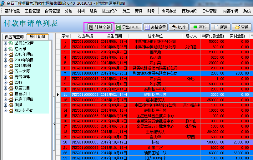 設(shè)置完成后點付款申請單列表中的“計算全部”這樣系統(tǒng)就會根據(jù)我們的設(shè)置彈出不同的顏色,就能快速的找到哪些沒有執(zhí)行付款、哪些已經(jīng)付款完成、哪些部分執(zhí)行付款。