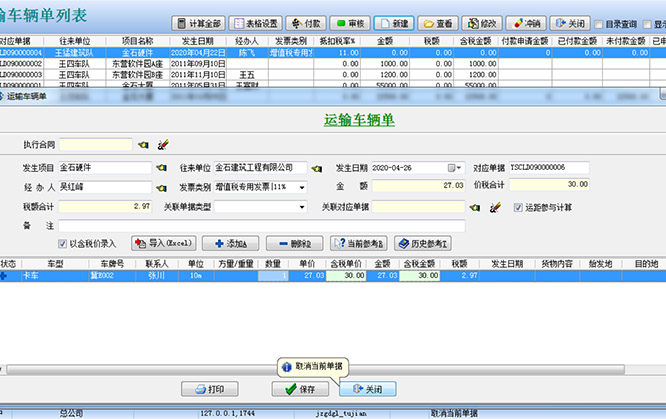 該單據是工程管理系統中車輛管理的基礎憑證,單據內部的數據,會對【工程成本】、【應付賬款查詢】、【供應商應付賬款匯總查詢】、【運輸車輛匯總表】這幾個模塊產生影響。