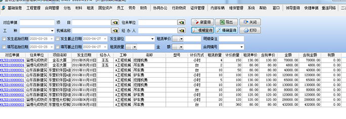 同時,已經生成的各種信息,可以在【外包機械明細查詢】模塊查詢所有的機械往來明細。