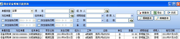 每日的信息也將在系統中自動匯總,形成固定設備明細萬能查詢,可以說是固定設備使用的總賬。