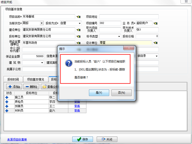 上圖中,張二、趙六兩個投標人員已參與恒達國際的投標項目,我們保存看下提示效果,如下圖: