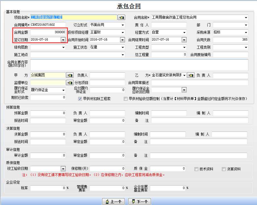 填寫好相應(yīng)的項(xiàng)目信息后,建立施工項(xiàng)目管理軟件承包合同。
