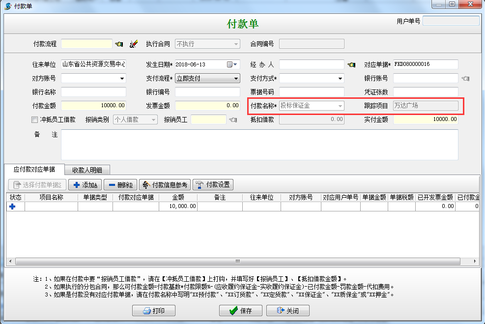 交納投標保證金時填寫“付款申請單”或者“付款單”,(如果填寫的是付款申請單則在付款申請單審核通過之后進行付款),如圖: