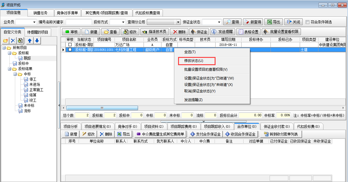 投標結果出來以后,將狀態改到“投標結果”的狀態,如圖: