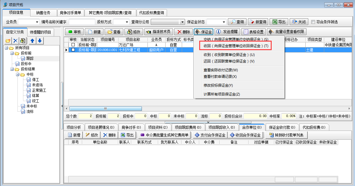 我方要從“保證金管理單位”將投標保證金收回。工程管理軟件的項目開拓中選中對應的項目,在“保證金”菜單中選擇“收回”,如圖所示: